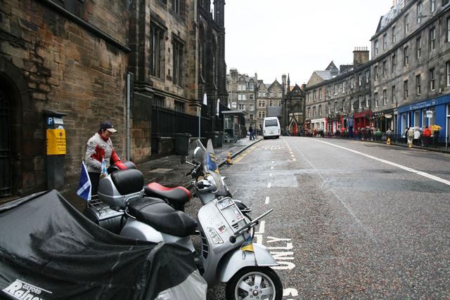 Heute war Werkstatt angesagt. Die Firma Eclipse Motorcycle in Tranent liegt 18 Meilen östlich von Edinburgh. Natürlich war die Fahrt dahin nicht trocken. Der einzige Vespahändler und Service von Schottland war nicht leicht zu finden. Kein großes Schild an der Straße, eine nicht mit Piaggio oder Vespa gekennzeichnete Einfahrt ohne Hausnummer auf ein Grundstück. Also nur für Insider. Ein kleiner Laden mit einer Werkstatt in der Größe einer Garage. Aber super nette, kompetente Menschen. Paul durfte auch gleich auf die Hebebühne zur Untersuchung. Nach einem Check stellte sich als Fehler die Zündkerze heraus. Mit einer neuen Zündkerze ging es dann, natürlich bei Regen, zurück nach Edinburgh. Unterwegs mussten wir in Musselburgh teilweise auf den Gehsteig ausweichen, weil die Gullis die Wassermengen nicht mehr bewältigten und dadurch sich die Straßen in Seen verwandelten. Es war teilweise ein Höllenritt. Je näher wir in die Stadt kamen, desto leichter wurde der Regen.